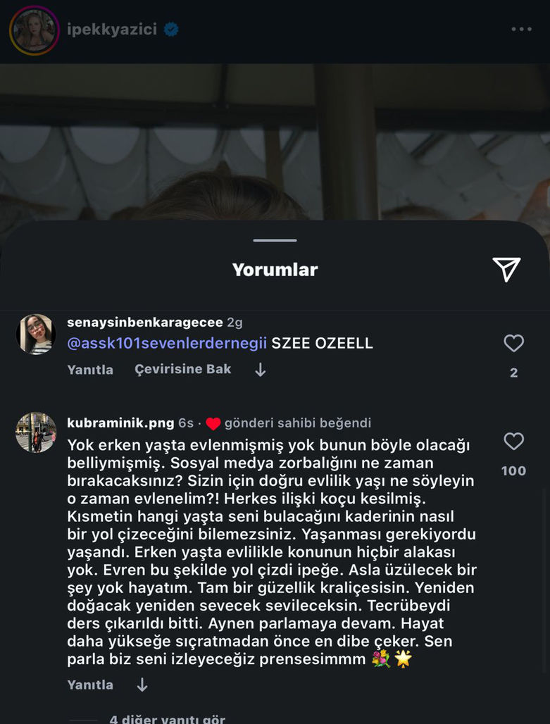 Boşanma haberinin ardından Yazıcı, takipçilerinden gelen destek dolu yorumları beğenerek yanıt verdi. Beğendiği yorumda, “Sosyal medya zorbalığını ne zaman bırakacaksınız? Kısmetin hangi yaşta seni bulacağını, kaderinin yolunu bilemezsiniz. Yaşanması gerekiyordu, yaşandı. Tam bir güzellik kraliçesisin. Yeniden doğacak, yeniden sevecek, sevileceksin… Sen parla, biz seni izleyeceğiz prensesim” ifadeleri yer aldı.