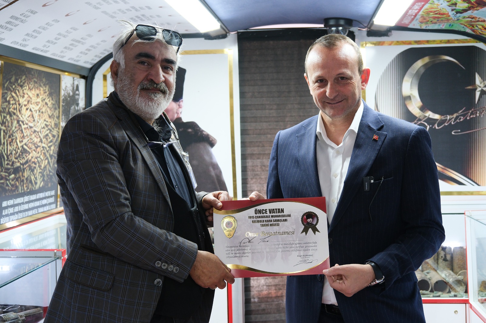 Müze otobüsünü ziyaret eden Çiftlikköy Belediye Başkanı Adil Yele, 110 yıl önce destansı bir mücadeleye sahne olan Çanakkale Savaşı’ndan izler taşıyan objeleri dikkatle inceledi. Başkan Yele’ye ziyaret sırasında İlçe Milli Eğitim Müdürü Zeki Sitar ve Belediye Kültür ve Sosyal İşler Müdürü Ali İhsan Demirhan da eşlik etti. Ziyaretin anısına Müze Sorumlusu Engin Korkmaz tarafından Başkan Yele, Müdür Sitar ve Demirhan’a onur belgeleri takdim edildi.