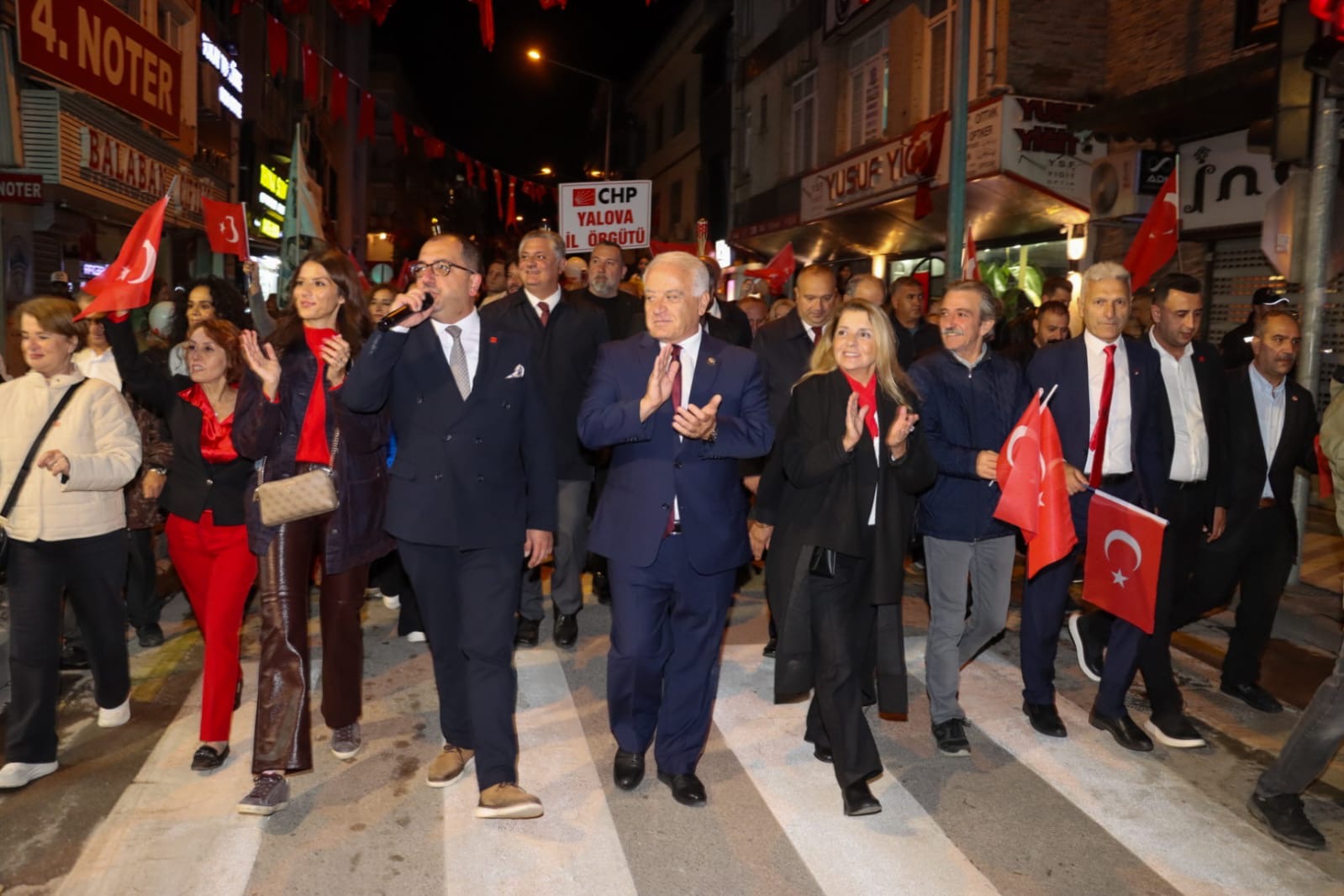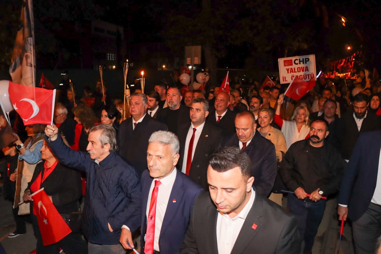 Türk bayrağı ve Atatürk posteriyle birlikte yürüyen vatandaşlara CHP Yalova İl Başkanı Erdem Doğancı öncülük etti. Doğancı, yürüyüş esnasında balkonlarda ve caddelerde bulunan vatandaşlara selamlarını iletti ve bayramlarını kutladı.