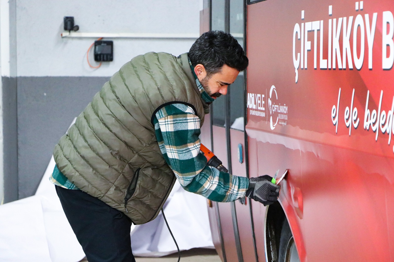 Çiftlikköy ile Yalova arasında her gün yoğun bir şekilde sefer yapan belediye otobüsleri, kırmızı ağırlıklı yeni görünümleriyle dikkat çekiyor. Kırmızı tonların degrade geçişlerle kullanıldığı dış cephe tasarımlarında, beyaz fontla yazılan Çiftlikköy Belediyesi’nin mottosu “el ele belediyecilik” ifadesi ön plana çıkarılırken, sosyal belediyecilik anlayışını simgeleyen kırmızı kalp içindeki birleşen eller figürü de tasarımın merkezinde yer aldı. Yeni tasarımlarla birlikte belediye otobüsleri yalnızca bir ulaşım aracı olmanın ötesine geçerek, Çiftlikköy Belediyesi’nin hizmet anlayışını da yansıtan birer hareketli vitrine dönüştü.
