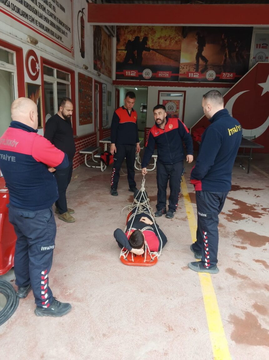 İtfaiye Müdürlüğü binasında gerçekleştirilen tatbikat, yangın alarmının devreye girmesiyle başladı. Bina personeli merdivenlerden tahliye edilirken, senaryo gereği bir personel binada mahsur kaldı. İtfaiye ekipleri, 30 metre merdivenli araçla tabyalama işlemi yaparak yangın söndürme ve kurtarma operasyonu başlattı. Mahsur kalan personel ise ekiplerin başarılı müdahalesi ile sedyeye konularak bulunduğu yerden güvenli bir şekilde tahliye edildi. Ekiplerin hızlı müdahalesi sonrası tatbikat başarılı bir şekilde tamamlandı.