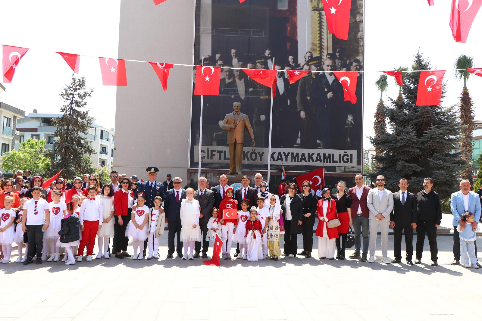 23 Nisan Ulusal Egemenlik ve Çocuk Bayramı, Çiftlikköy’de büyük bir coşku ve katılımla kutlandı. Kaymakamlık Meydanı’nda düzenlenen törene Çiftlikköy Kaymakamı Ali Ada, Hava Meydan Komutanı Hv. Plt. Kd. Albay Mert Uysal, Çiftlikköy Belediye Başkanı Adil Yele’nin yanı sıra siyasi parti temsilcileri, kamu kurumları, sivil toplum kuruluşları, öğretmenler, öğrenciler ve vatandaşlar katıldı.