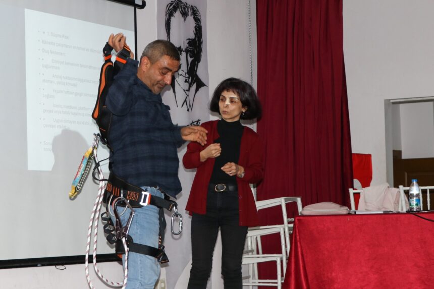 İş Sağlığı ve Güvenliği Uzmanı Hatice Güner tarafından verilen eğitimde, yüksekte çalışma sırasında karşılaşılabilecek riskler, ilgili mevzuatlar, kişisel koruyucu donanımların seçimi ve doğru kullanımı, güvenli bağlanma teknikleri ile acil durum ve kurtarma yöntemleri detaylı şekilde ele alındı. Güner, emniyet kemeri, konumlandırma halatları ve karabina gibi ekipmanların doğru kullanımını uygulamalı olarak göstererek personelin dikkat etmesi gereken noktaları aktardı.