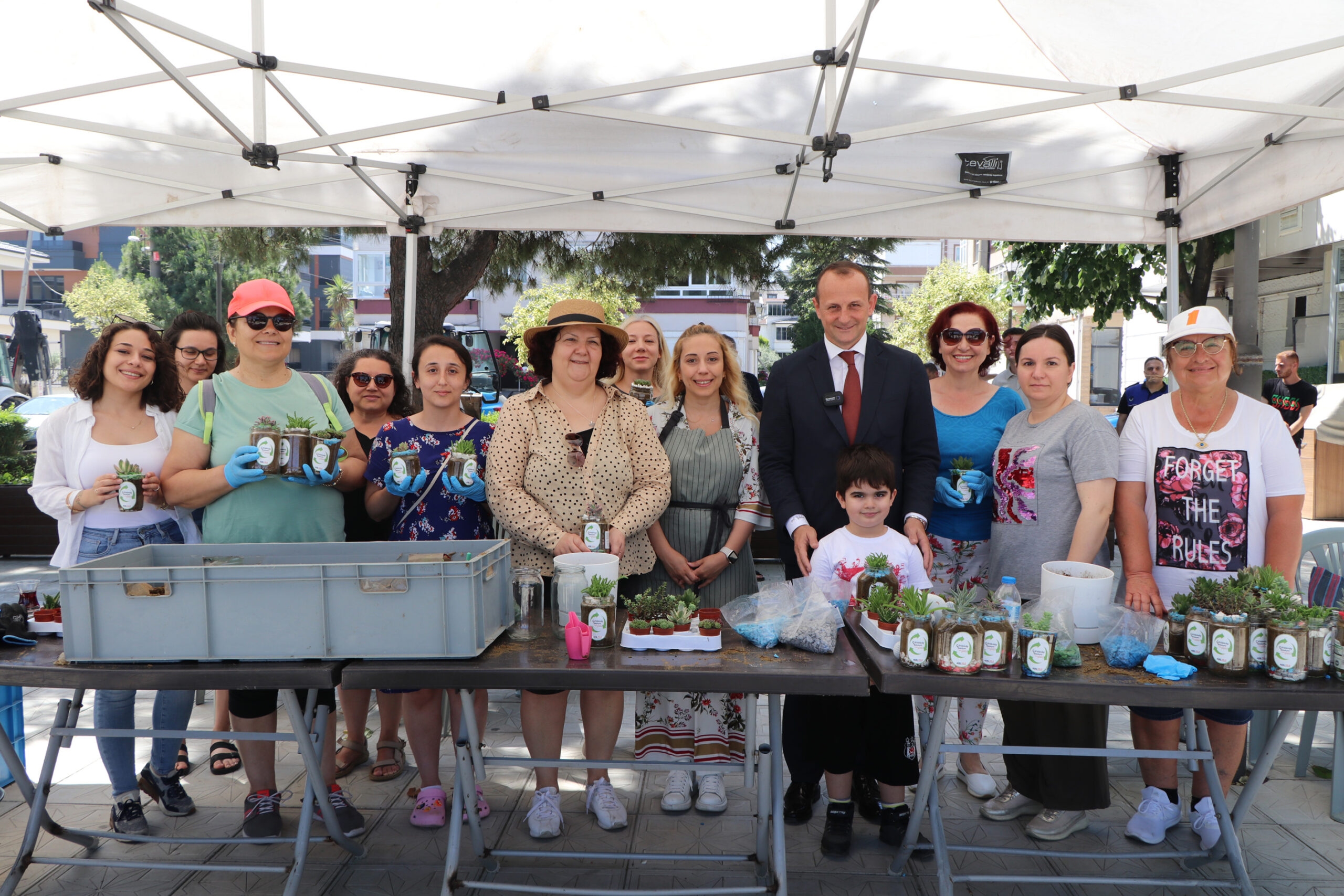 Toprak Atölyesi’nde yapılan çalışmaları aktaran Çiftlikköy Belediyesi İklim Değişikliği ve Sıfır Atık Müdürü Emine Yeşim Aras da, “Etkinliğe katılanlar, evlerinden getirdikleri cam kavanozları belediye tesislerinde üretilen organik toprakla dolduruyor. Ardından belediyemizin hediyesi olan sukulent çiçeklerini buraya ekiyorlar. Son adım olarak dekoratif bir görünüm sağlaması amacıyla renkli taşlarla kavanozumuzun üst kısmını dolduruyoruz. Belediyemizin günün anısına bastırdığı logolu etiketleri kavanoza yapıştırarak dekoratif çalışmayı tamamlamış oluyoruz” diye bilgi verdi.