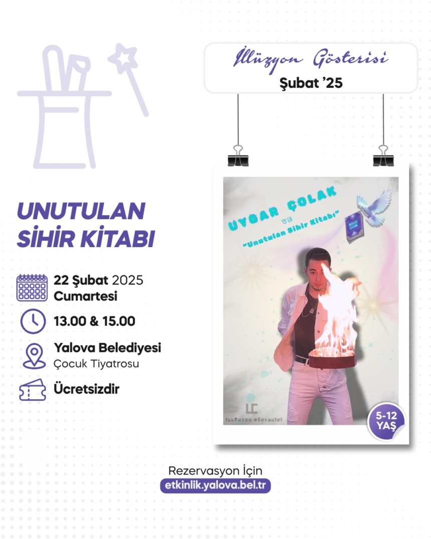 Yalova Belediyesi, çocuklara yönelik büyüleyici bir etkinlik düzenliyor. Ünlü İllüzyonist Uygar Çolak, “Unutulan Sihir Kitabı” adlı gösterisiyle minik izleyicilere unutulmaz anlar yaşatacak.