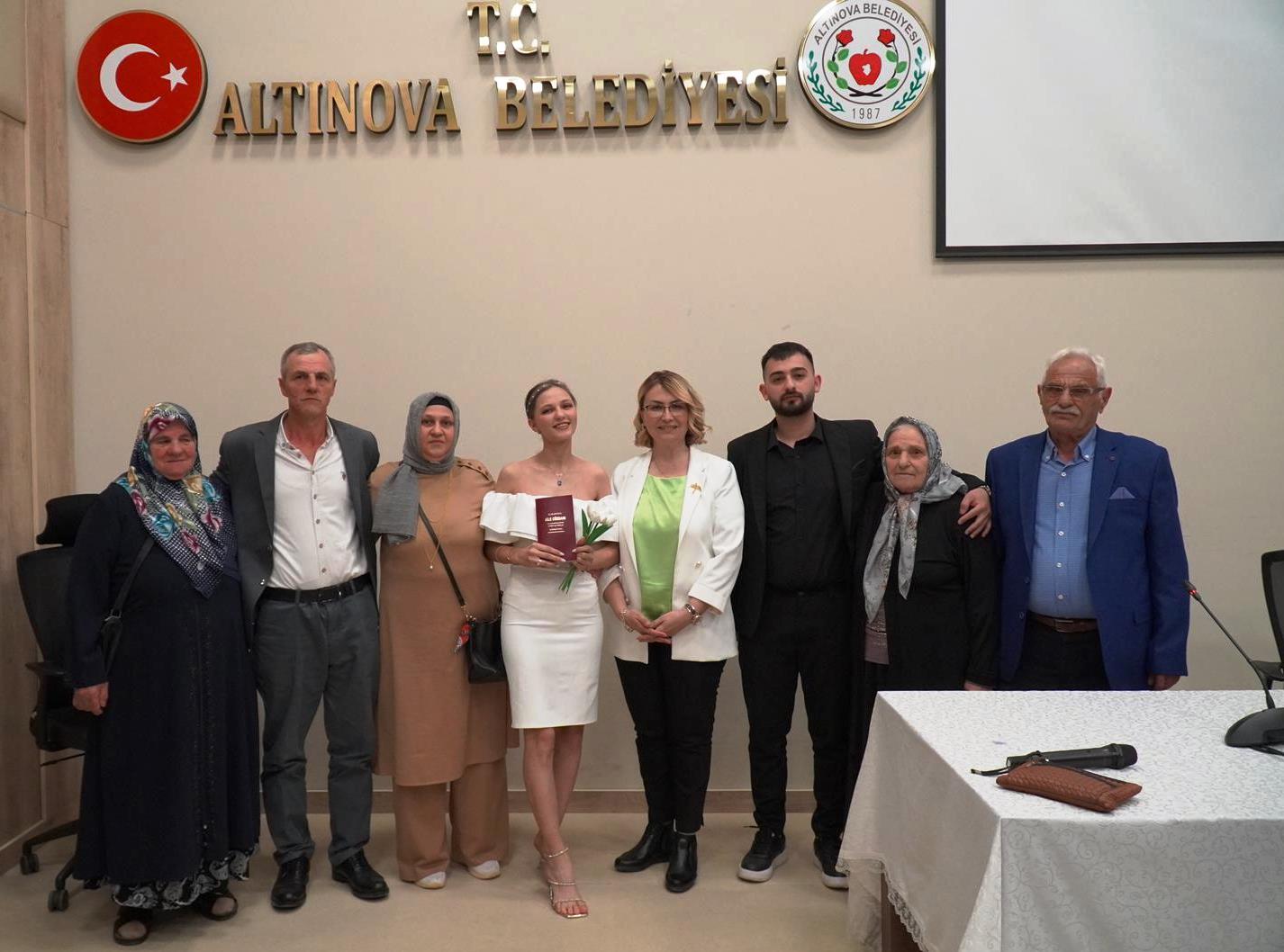 Altınova Belediye Başkanı Yasemin Fazlaca’nın ilk icraatı, ilçenin tanınan ve sevilen gençlerinden Merve Çelik ve Özgür Palaşoğlu çiftinin nikahını kıymak oldu.