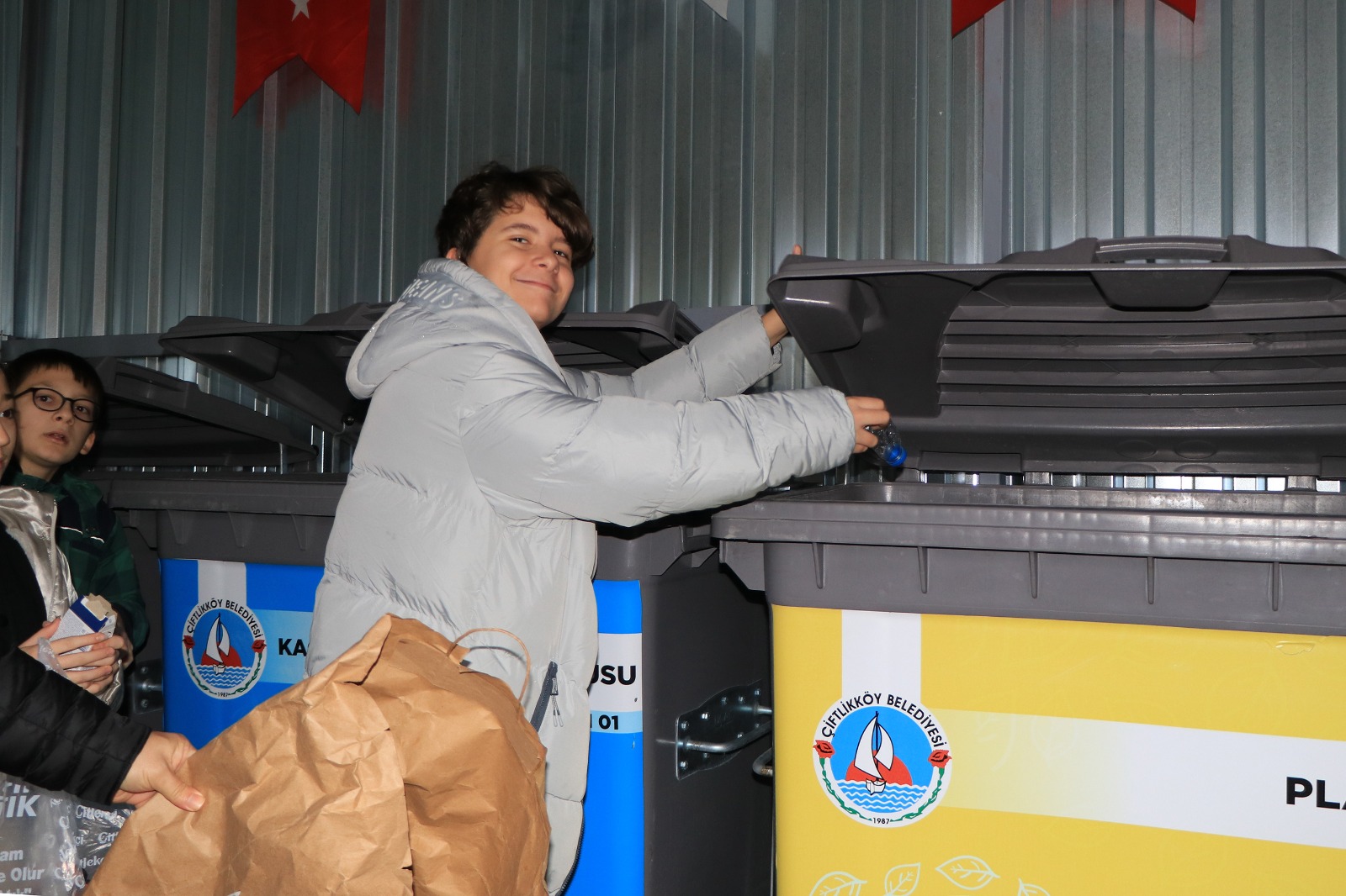Proje kapsamında yanlarında getirdikleri cam, metal, kağıt gibi ambalaj atıklarını yerinde ayrıştıran öğrenciler, Çiftlikköy Belediyesi İklim Değişikliği ve Sıfır Atık Müdürü Emine Yeşim Aras’tan geri dönüşüm, atık azaltımı ve sıfır atık kavramının yanı sıra iklim değişikliği ile mücadelede bireysel olarak neler yapılabileceği hakkında bilgiler edindi. İklim değişikliği ile mücadelede karbon ayak izi kavramını anlatan Aras, evlerde uygulanabilecek atık azaltım çalışmalarından örnekler vererek, karbon ayak izini düşürmede atıkların geri dönüşüme kazandırılmasının da katkısı olduğunu dile getirdi. Sunumun ardından tesisi gezen öğrenciler, deniz yosunlarından ve evsel organik atıklardan organik toprak üretiminin yapıldığı kompost tesisini de gezdi. Çiftlikköy Belediye Başkanı Adil Yele’nin hediyesi olarak öğrencilere 1’er litrelik kompost paketleri hediye edilmesinin ardından öğrenciler tesisten ayrıldı.