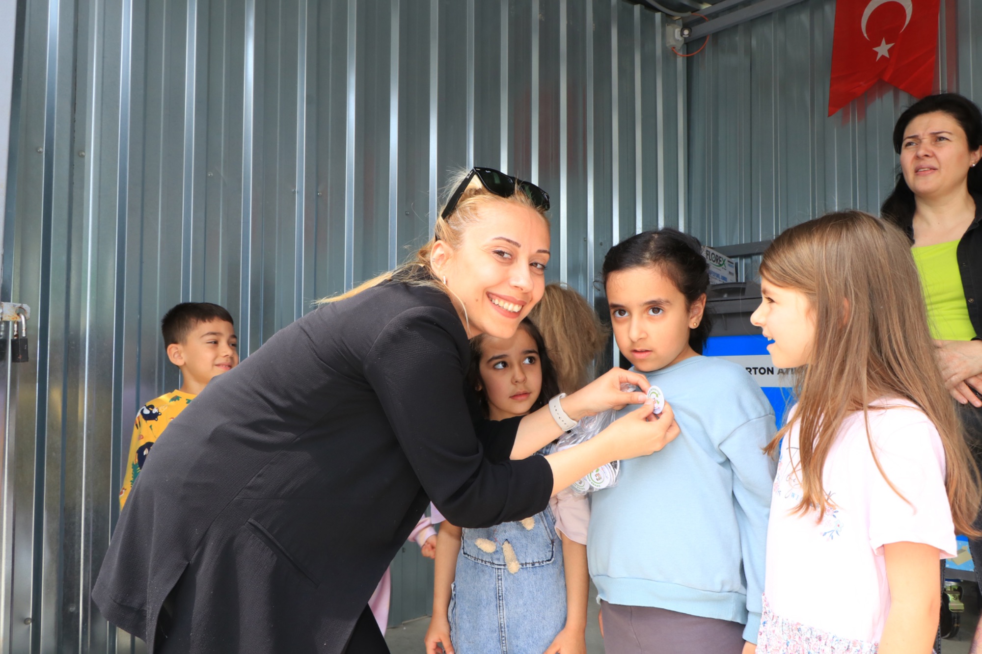Belediyesi İklim Değişikliği ve Sıfır Atık Müdürü Emine Yeşim Aras, geri dönüşüm sürecine sağladıkları katkılardan dolayı minikleri tebrik ederek 40 öğrenciye çevre müfettişi rozetlerini taktı.