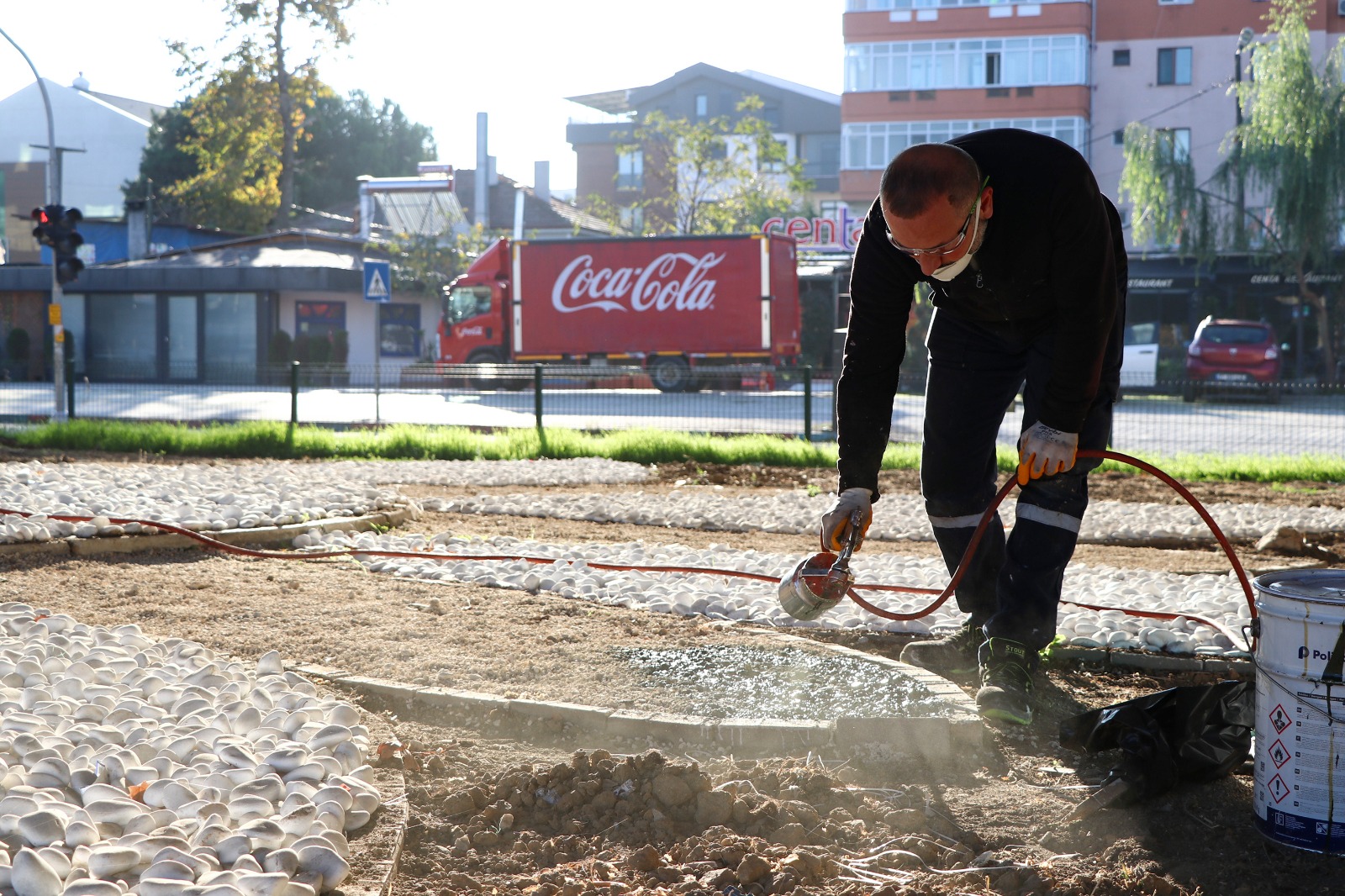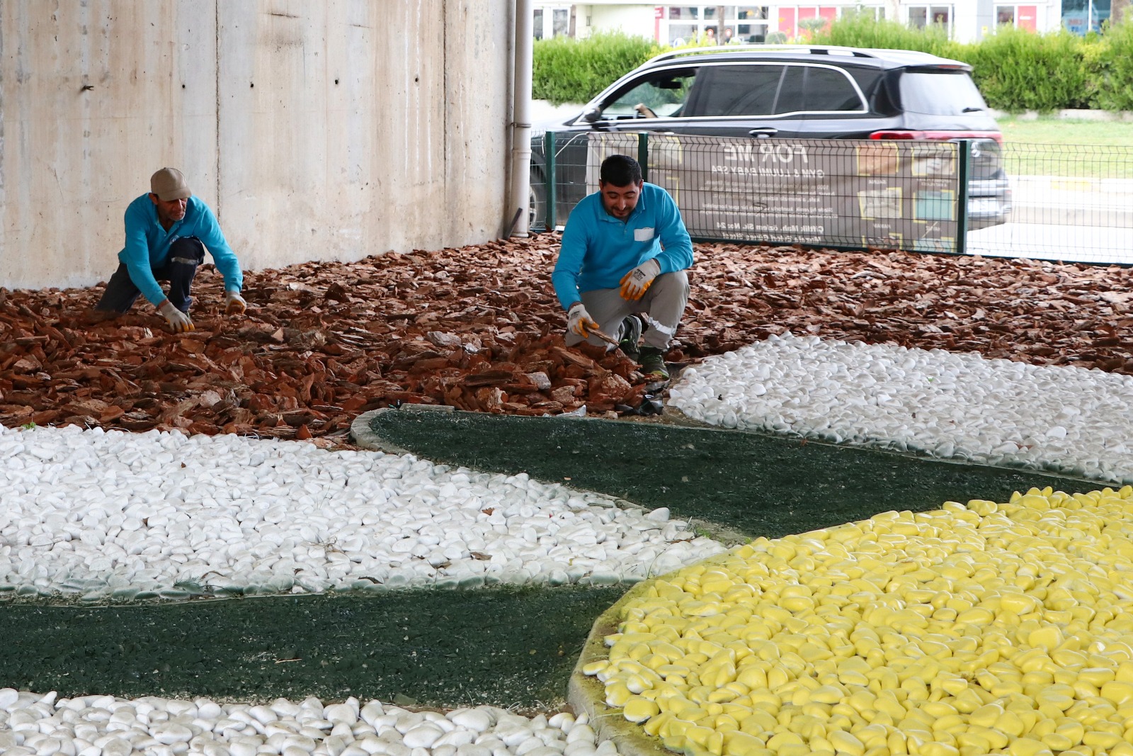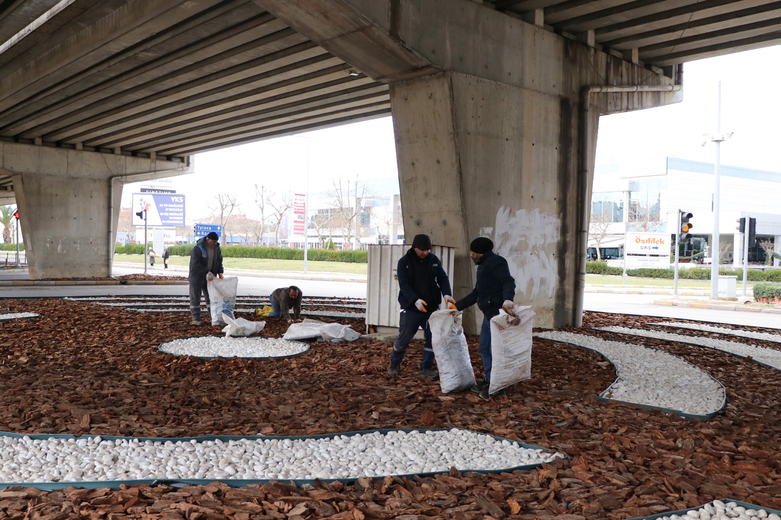 Düzenleme kapsamında zemin dolgusu ağaç kabuklarıyla oluşturulurken, zemin çerçevesi içerisinde sarı, beyaz ve yeşil renkli dolomit taşları kullanıldı. Çiçek ve daire formunda tasarlanan desenlerle hem görsel bütünlük sağlandı hem de kavşağın estetik değeri artırıldı.