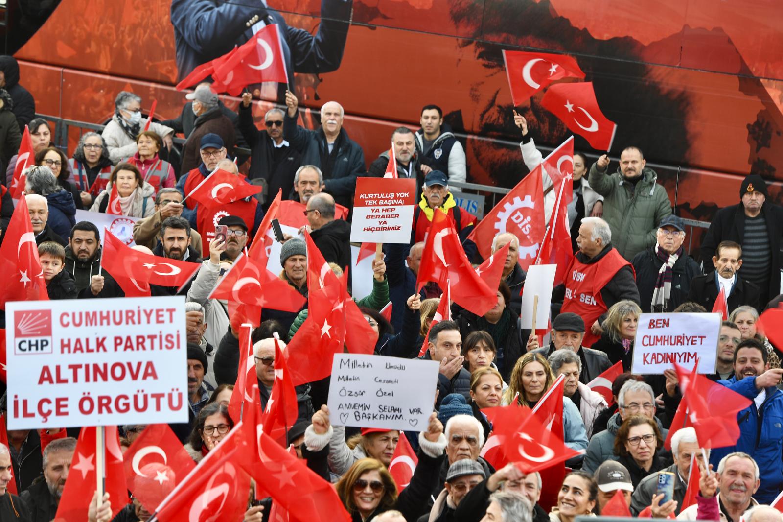 “Yalova’dayız. Bugün hava şartlarının beklenenden daha iyi olduğu bir gündeyiz ama Ocak’ın ortasında seçim yokken, seçim atmosferi yokken bu meydanın böyle tarihi bir kalabalıkla dolması birilerini şaşırtıyor. Hatta belki dün bu meydana biz araçlarımızı getirdiğimizde birileri, ‘Buraları dolduramazlar’ diye bakmış olabilir. Ama bugün Yalova tarihinin en muhteşem birlikteliklerinden bir tanesindeyiz. Şüphesiz buraya kışın ortasında böyle bir mitinge gelmedik. Biz buraya bir hak aramaya, itiraz etmeye, sesimizi yükseltmeye, her türlü adaletsizliğe, emeklilere yapılan adaletsizliklere, emekçilere yapılanlara, her yaştan insanımızın gelecek kaygılarına ve hiç şüphe yok ki bu ülkenin Cumhuriyet’le birlikte bulduğu ve asla bırakmadığı seçme ve seçilme hakkına, sandığa sahip çıkmaya, seçtiklerimize ve irademize sahip çıkmaya geldik. 19 Mart darbesinden sonra 310’uncu günde bugünün iktidarının yarının iktidarına, bugünün cumhurbaşkanının yarının cumhurbaşkanına darbe girişimine karşı Yalova’ya 84’üncü eylemimizde direnmeye, mücadeleye, eyleme geldik. Hepiniz hoş geldiniz.”
