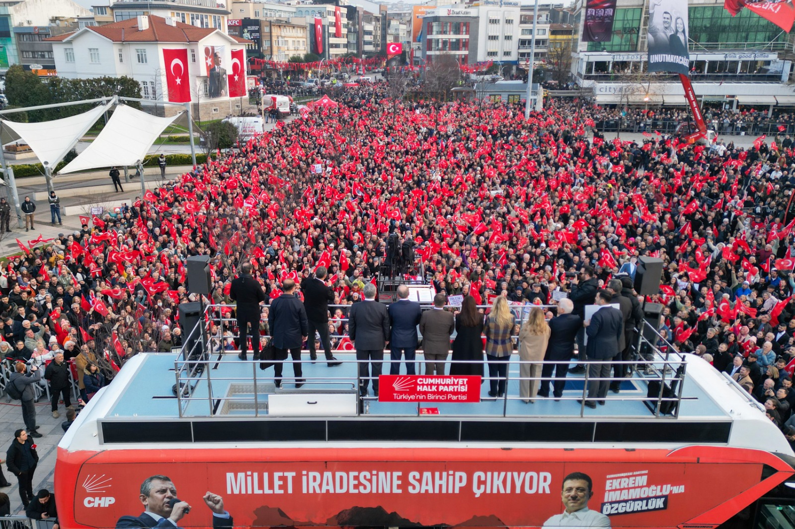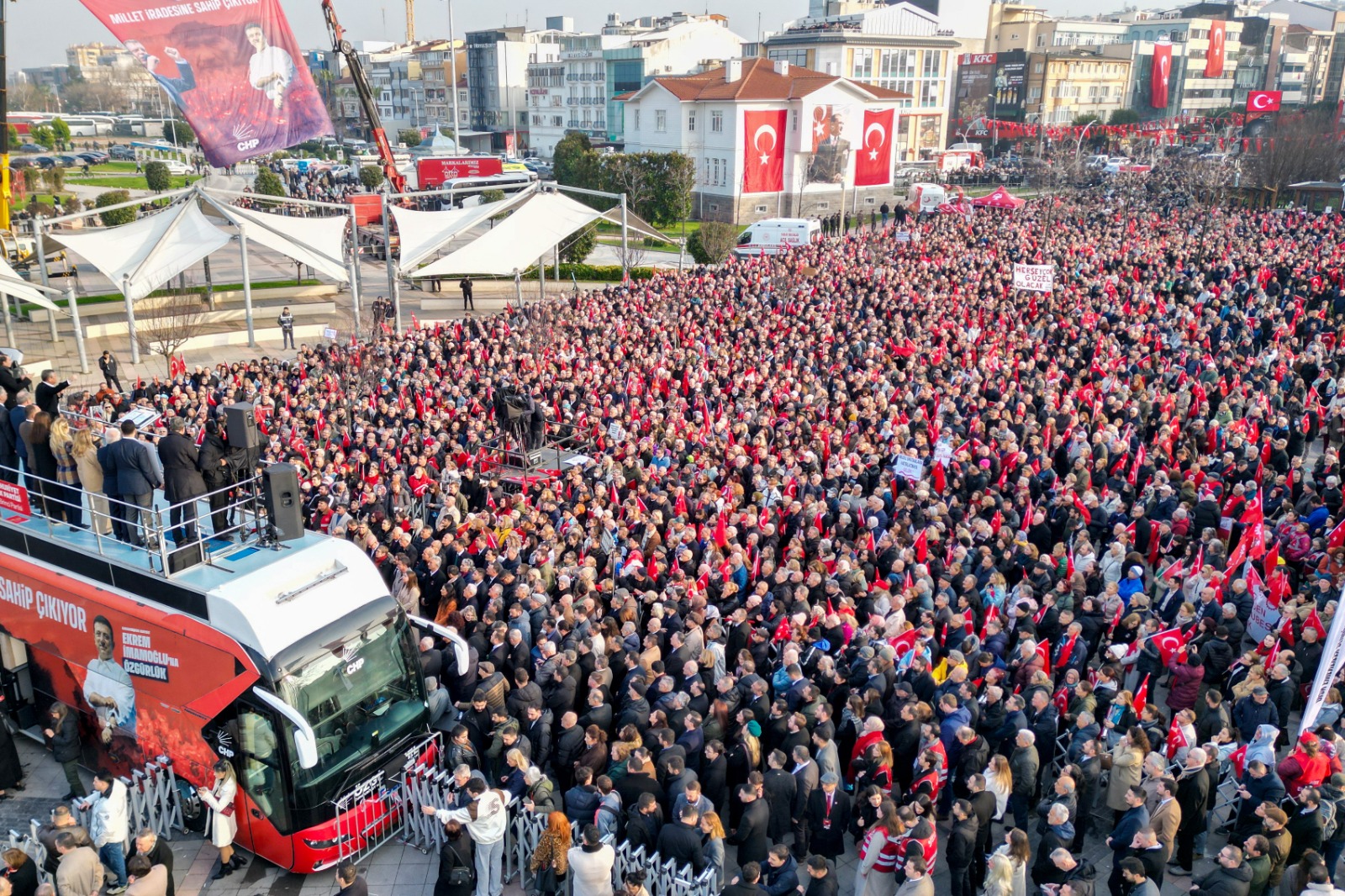 “Ekrem Başkan’a ‘yolsuz’ dediler, ‘PKK’lı’ dediler, ‘casus’ dediler. Hepsinin altı boş çıktı. Şimdi çıktılar bir uçak yalanı attılar. Utanmadan koca Sabah gazetesi onun güya köşe yazarı yalanlarıyla övünenler, övün, övün yalanlarınla övün. Çıktılar, dediler ki ‘Uçakta şu oldu, bu oldu, bu oldu.’ Ama uçağın sahibi AK Partili çıktı. Uçağı işleten AK Partili çıktı. Verdikleri isim AK Partili çıktı. Ortağı AK Parti’nin bir önceki il başkanı çıktı. İhaleyi veren İstanbul Büyükşehir değil, bakanlık çıktı. Paranın verildiği yer İBB değil, İstanbul Valiliği çıktı. Uçakta gezen tozanlar AK Partili çıktı. Ama geçen hafta Erdoğan çıktı dedi ki ‘Milletin parasıyla gününü gün eyleyenler.’ Buradan Erdoğan’a sesleniyorum. Cumhuriyet Halk Partisi’nde milletin kör kuruşuna tenezzül eden yok. Cumhuriyet Halk Partisi’nde ‘Kreş yaptır, dozer al, yurt yaptır’ dışında iş adamının parasına el süren yok. Sadece hizmete yönlendiren var. Ama senin dört tane bakanın ayakkabı kutularıyla çıkan paraları önce ‘FETÖ koydu’ deyip, sonra faiziyle geri istediler. O ayakkabı kutularından çıkanların hesabını vermediğin gibi, o gün bile ‘Devletten çıkmadıktan sonra rüşvet denmez’ diye onu bile makul göstermeye çalışmıştın. Burada Erdoğan’a söylüyorum. Bu meydanlar boşa konuşmaz. Bu meydan, bak şu meydan, geçen gün o kırılası ellerin saldırdığı ay yıldızlı Albayraklarla dolu şu meydan. Bu meydan boşa konuşmaz Erdoğan. Bu meydanlar bir şey söylüyor. Bir devri kapatıyoruz, bir devri açıyoruz. Erdoğan’ın evlatlarının, bakanlarının, bakan evlatlarının devri bitiyor. Vatan evlatlarının devri başlıyor. Vatan evlatlarının.”