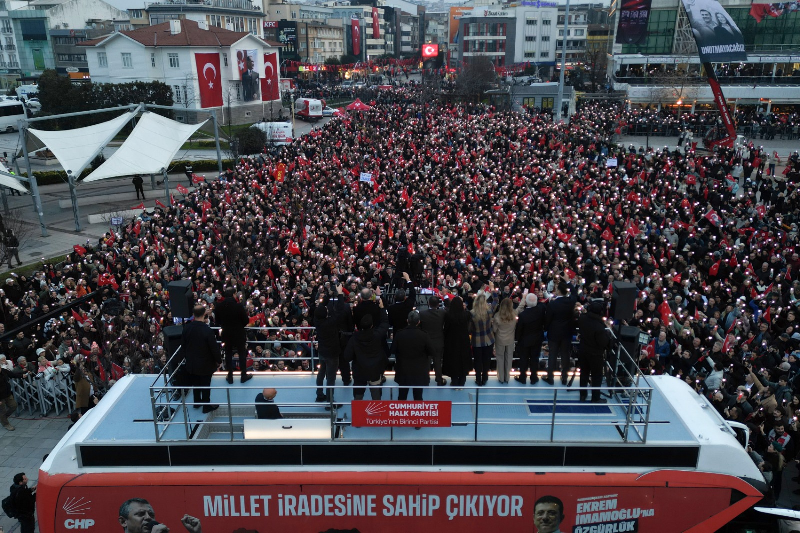 “Değerli Yalovalılar, 19 Mart bir sivil darbeydi, biraz önce söyledim. O günden bugüne 310 gün geçti. 50 gün sonra tam bir yıl olacak. Arkadaşlarımız cezaevlerinde tutuluyorlar. O arkadaşlarımız, cezaevine ilk atıldıklarında, Erdoğan, her zamanki üstten, kibirli bakışıyla dönüp, ‘Göreceksiniz, bir ay sonra insan içine çıkamayacaklar. Birbirlerinin yüzlerine bakamayacaklar. Eşlerinin bile yüzüne bakamayacaklar’ demişti. Şimdi buradan, Yalova‘dan, Erdoğan’a, salon adamı Erdoğan’a, yazları serin salon, kışları sıcak salon seven, insan içine çıkamayan Erdoğan’a sesleniyorum. Kışın ortasındayım. Yalova Meydanı’ndayım. On binlerle, yüz binlerle iç içeyim. Yüz yüzeyim, göz gözeyim. Buradan ilan ediyorum ki arkadaşlarımız suçsuzdur. Söyleyen herkes iftiracı, söylenen her şey iftiradan ibarettir. Buradan Erdoğan’a soruyorum. Hadi Erdoğan’a değil, Yalova’ya sorayım, Erdoğan duysun. Yaz boyunca TRT’de, A Haber‘de, TGRT’de… Çeşit çeşit yalan attılar. ‘560 milyar lira yolsuzluk’ dediler. 560 kuruşunu ispat edebildiler mi? ‘Bin 200 tane cep telefonu dağıtıldı’ dediler. Bir tanesini ispat edemediler. İddianameye yazabildiler mi? ‘Parkenin altında 2 milyon Euro bulundu’ dediler. ‘Görüntüleri var’ dediler. İddianameye yazamadılar. Görüntüyü çıkaramadılar, iftiranın arkasında duramadılar. Onların bu iftirasına inanan var mı? ‘Ekrem İmamoğlu’nun lüks araçları’ dediler MHP’li vekilin çıktı. ‘Para dolu valizler bulduk’ dediler, içlerinden jammer çıktı. ‘Gaziosmanpaşa Belediyesi’nin kasasında dolar çıktı’ dediler. Küçücük belediyenin mührü çıktı. ‘Ordu’daki yayla evinden Euro‘lar bulduk’ dediler. 48 tane ruhsatlı silahın mermisi çıktı.”