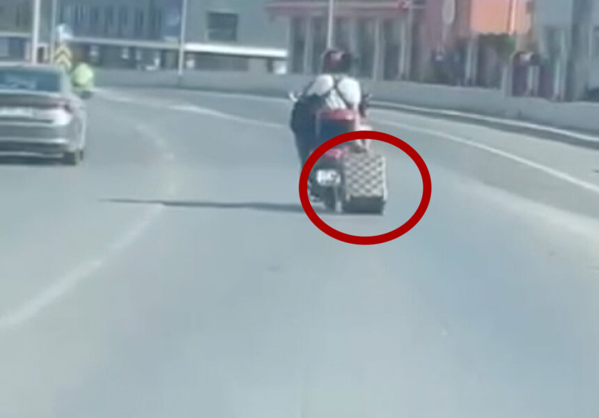 Yalova’da bir motosikletin arkasına oturan kişinin arkasından tekerlekli valizi sürüklediği anlar cep telefonu ile kaydedildi.