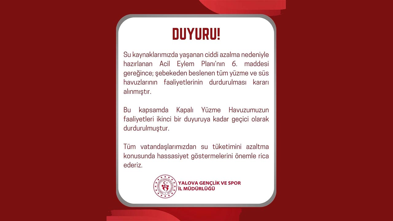 Yalova Gençlik ve Spor İl Müdürlüğü, Yalova İl Su Kurulu’nun aldığı karar doğrultusunda Kapalı Yüzme Havuzu’nun ikinci bir duyuruya kadar kapatıldığını açıkladı.