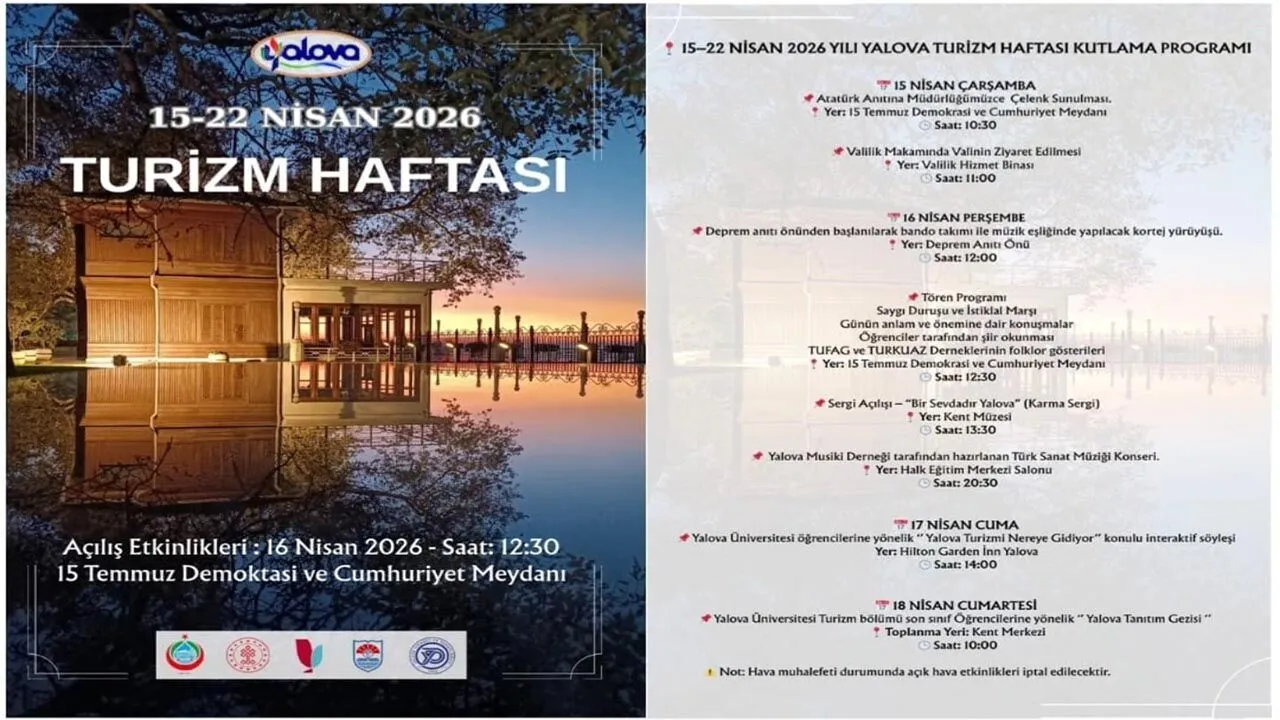 Türkiye genelinde her yıl 15–22 Nisan tarihleri arasında kutlanan Turizm Haftası için Yalova’da hazırlıklar tamamlandı. Kente özgü doğal güzelliklerin, tarihi mirasın ve kültürel değerlerin tanıtılacağı hafta boyunca birbirinden renkli etkinlikler düzenlenecek.